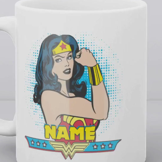 Channel inner strength with this bold Wonder Woman mug, featuring superhero vibes and space to add a custom name. A fantastic gift for strong women, comic lovers, and everyday heroes. Also available as a matching coaster and card